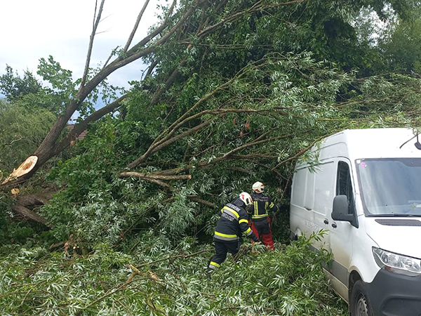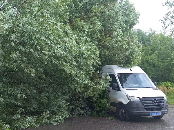 Nach einem Regenschauer stürzte ein Baum auf einen abgestellten Transporter. Beim Eintreffen der Einsatzkräfte blockierte der Baum das Fahrzeug vollständig. Mittels Motorkettensäge wurde der Baum zerkleinert und anschließend mit der Seilwinde des Rüstfahrzeugs vom Transporter entfernt.