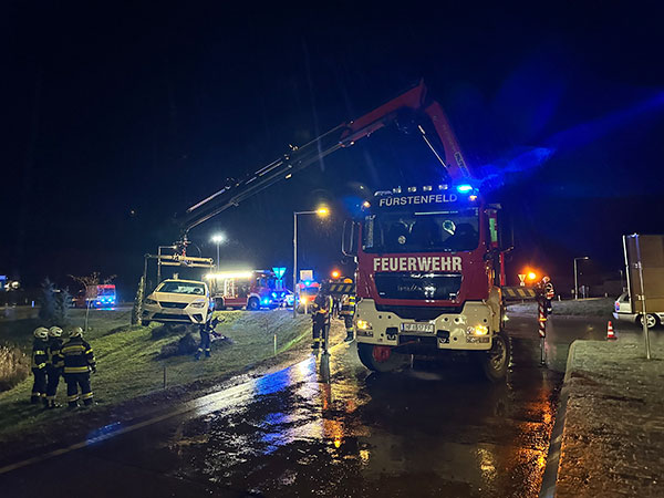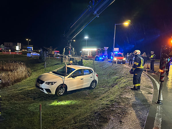 Wir wurden kurz nach 20 Uhr zu einem Verkehrsunfall auf der Burgauer Straße - L401 auf Höhe Kreisverkehr McDonalds alarmiert. Beim Eintreffen stellten wir fest, dass sich das Fahrzeug angrenzenden Graben befand. Mittels Hebekreuz wurde der Wagen auf die Straße gehoben. Die Lenkerin wurde unbestimmten Grades verletzt. |