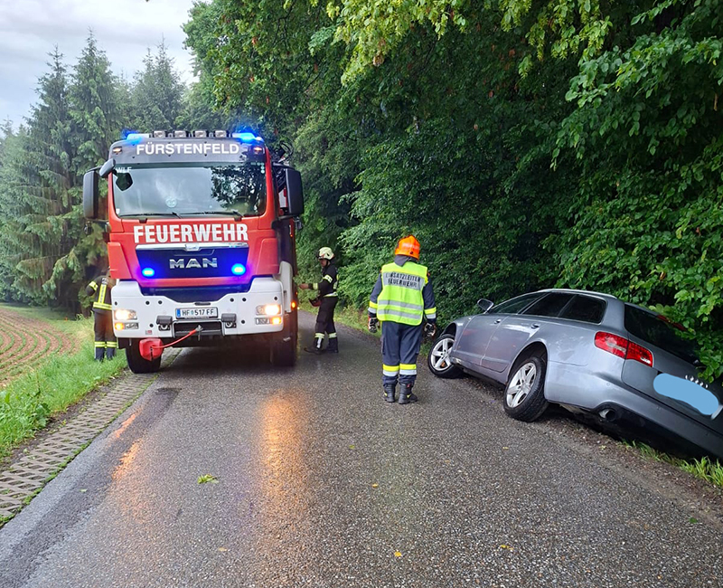 Wir wurden mit unserem Wechselladefahrzeug mit Kran (WLF-K) von den Kameraden der Feuerwehr Jobst zur Unterstützung bei einer Fahrzeugbergung nachgefordert. Ein Lenker war mit seinem Wagen in den Graben geraten. Um bei der Bergung keine Schäden im unteren Bereich des Wagens zu verursachen, wurde der PKW mittels Ladekran aus dem Graben gehoben. Nach der Bergung konnte der Lenker seine Fahrt mit dem Wagen fortsetzen. |