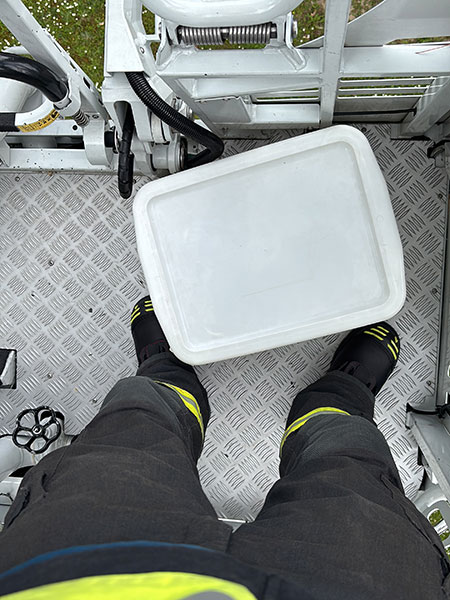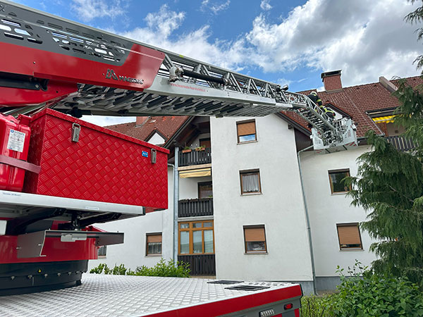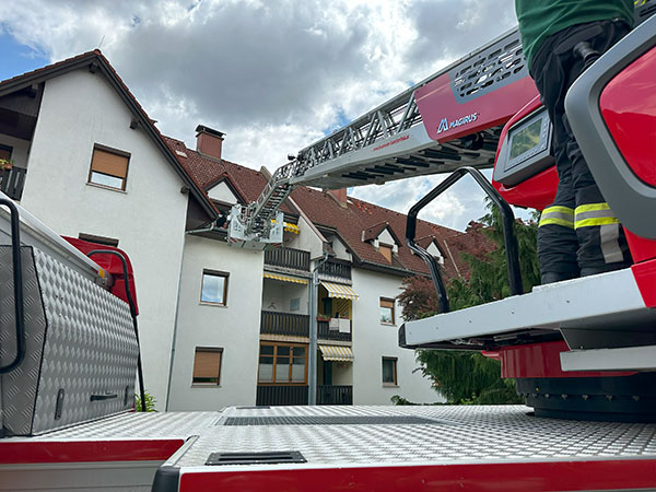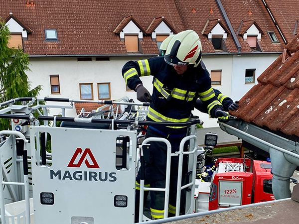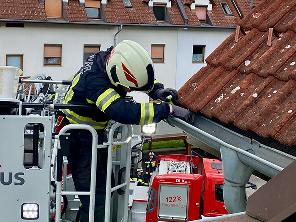 Zur Mittagszeit wurde der Bereitschaftsdienst von einer aufmerksamen Bewohnerin zu einer Tierrettung alarmiert. Ein Vogel hatte sich in einem Vogelschutzgitter unter dem Dach eines Wohnhauses verfangen und konnte sich aus eigener Kraft nicht mehr befreien. Unsere Mannschaft rückte mit der Drehleiter zum Einsatzort ab fand das Tier in der Dachrinne des dreistöckigen Gebäudes. Um an das Tier zu gelangen, musste ein Dachziegel vorsichtig angehoben werden. Der Vogel war im Vogelschutzgitter verheddert und wurde schließlich mit viel Geschick und großer Sorgfalt befreit. Abschließend wurde der Vogel in fachgerechte Hände übergeben.