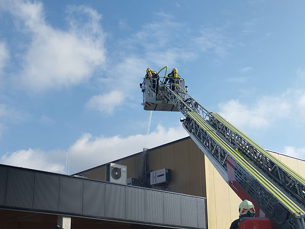 Mithilfe der positionierten Drehleiter und unter Zuhilfenahme von schwerem Atemschutz konnte der Brand, welcher sich noch nicht weiter ausgebreitet hatte, rasch gelöscht werden. Da die Innenräume im betroffenen Bereich verraucht waren, wurden diese mittels Druckbelüfter rauchfrei gemacht.